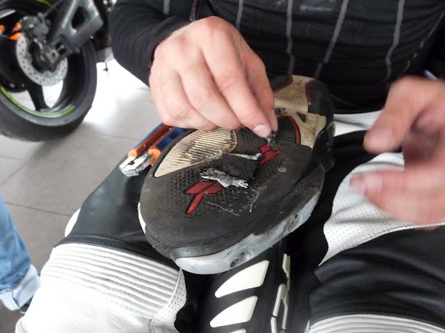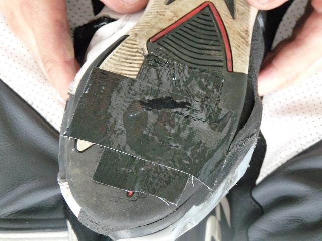 J'ai eu un problème de botte lors de mon dernier roulage piste, le cale pied droit a transpercé la semelle. Du coup j'ai réparé avec ce que j'ai trouvé :